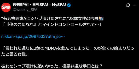 【週刊SPA報道】「シャブ漬けされた」と語る女性、有名格闘家Aとは