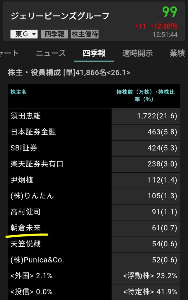 朝倉未来、ジェリービーンズの大株主の模様