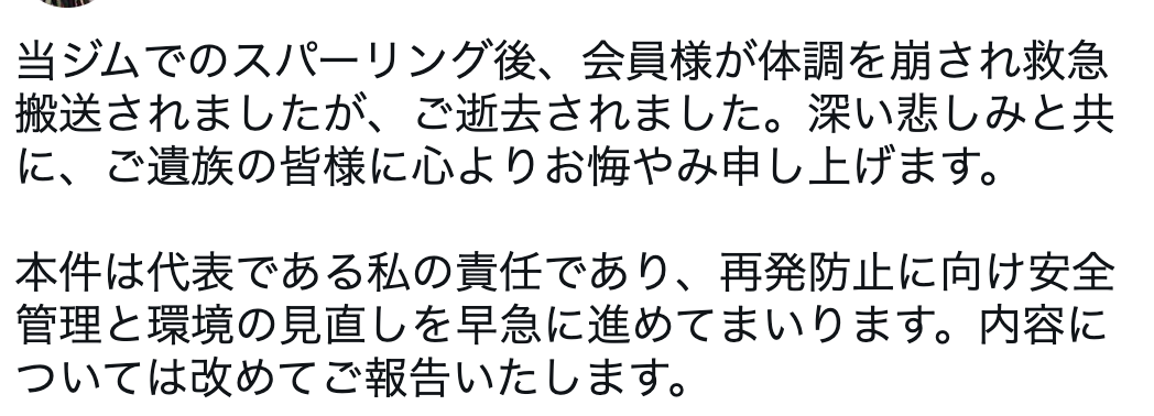 当ジムでのスパーリング後、会員様が体調を崩され救急搬送されましたが、ご逝去されました。深い悲しみと共に、ご遺族の皆様に心よりお悔やみ申し上げます。
