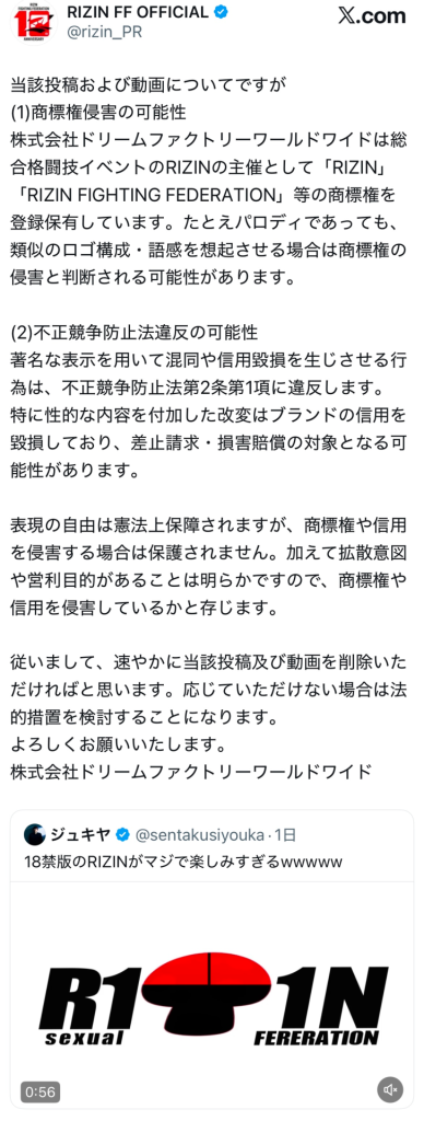 RIZIN運営、パロディにお怒り※該当ポストは既に削除済み